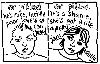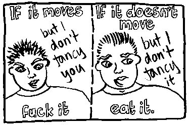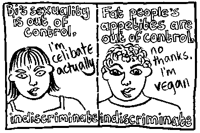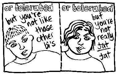 Rachael House is a famous bi cartoonist. Here is just one of her wonderful cartoons. If you want to see more then you can email her at redhankypanky@btinternet.com and find out about buying glorious zine "Red Hanky Panky" via snail mail.