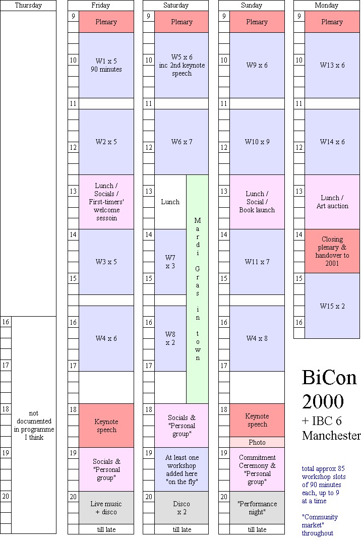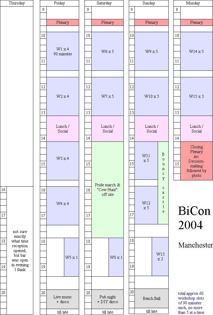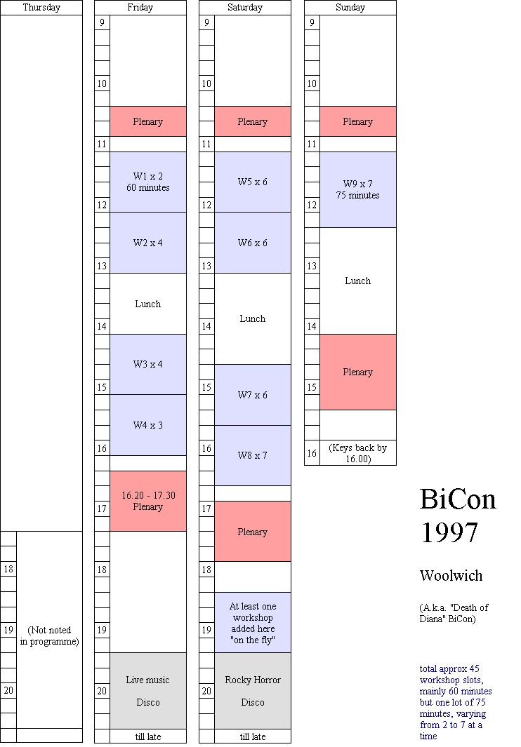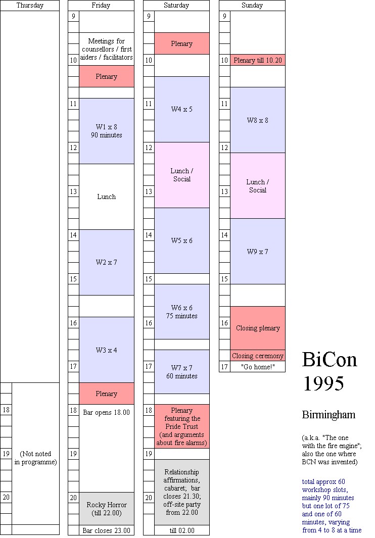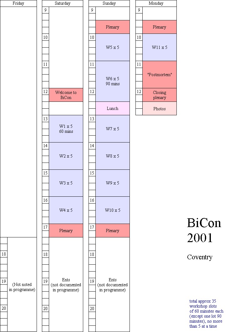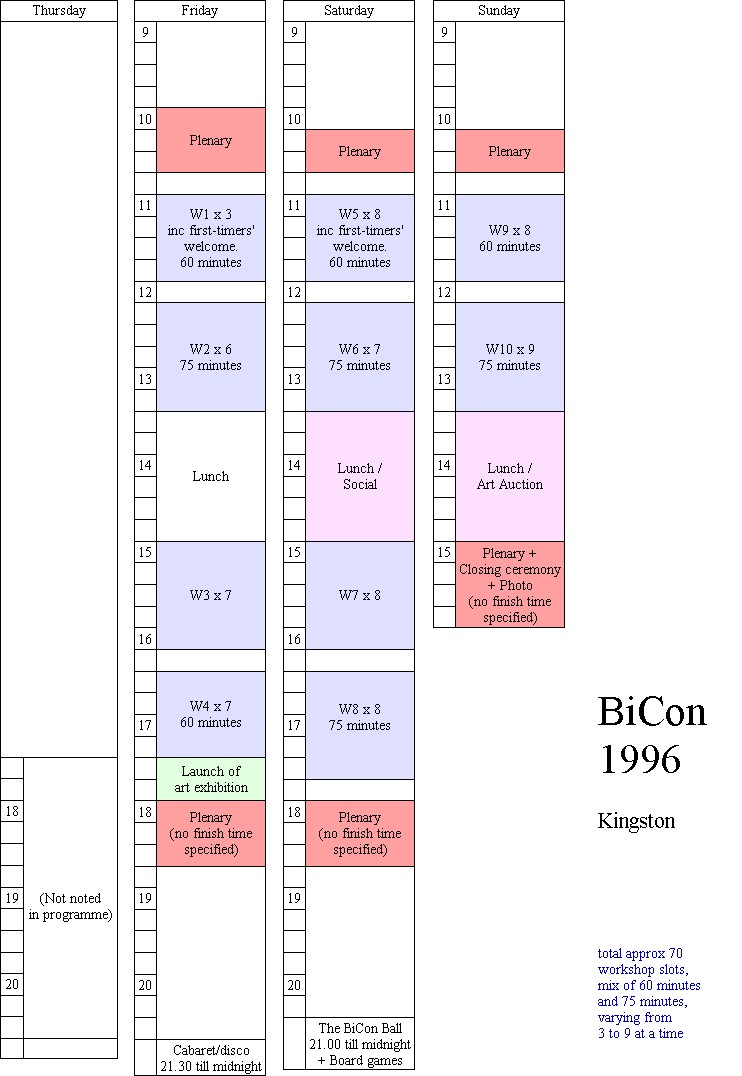 In the run-up to BiCon 2005, I was keen to get my head around the variables in BiCon timetabling, and its history, so as to learn from the past and not "reinvent the wheel". I looked through the programmes for the BiCons I'd been to, and borrowed a couple of older programmes as well.
