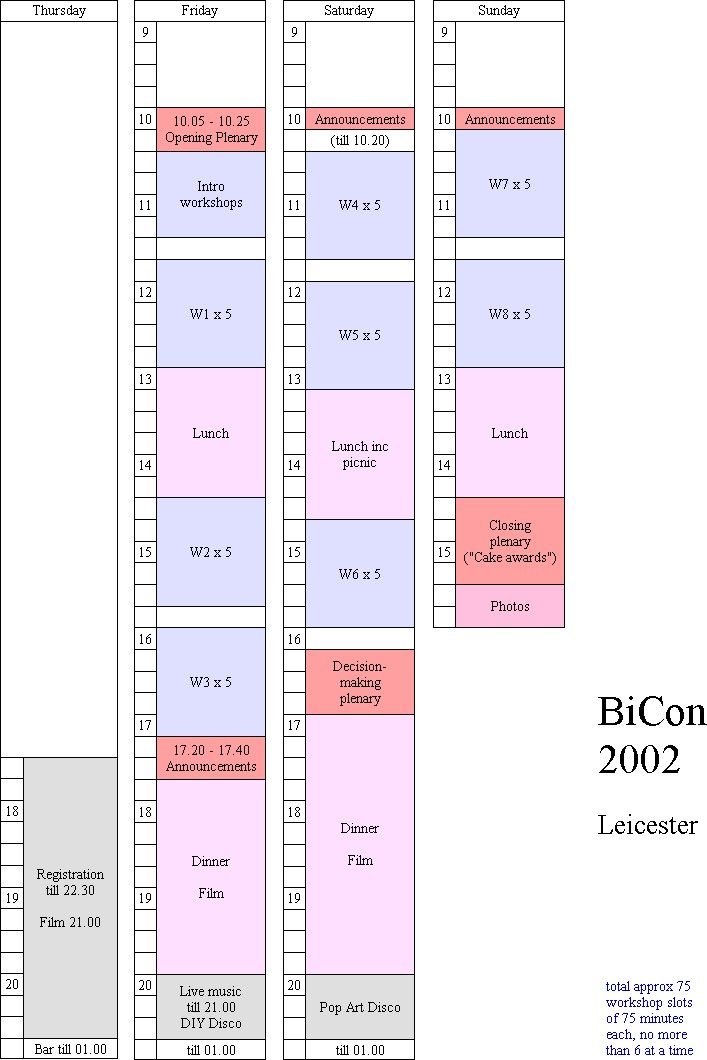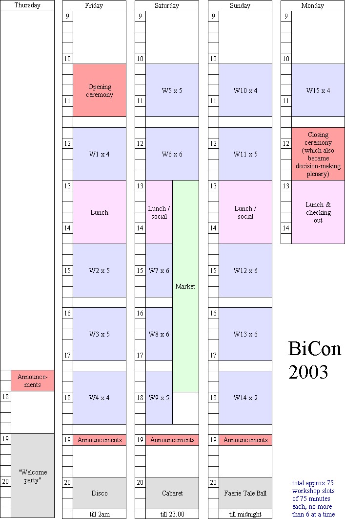Having mulled over those structures, and my memories of the BiCons they represent, I did a similar pic showing my ideas for 2005. We did change it slightly (my original draft had the closing ceremony after lunch, with an additional workshop session on the last morning), but most of it survived to become the BiCon 2005 timetable, shown here in a similar format for comparison (181k).