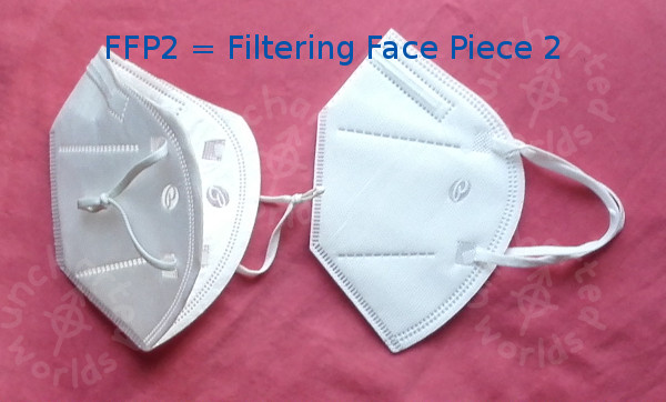 FFP2 = Filtering Face Piece 2. Two white masks with ear loops, seen from the side. The one on the right is brand new and flat. The one on the left has been opened out. Its ear loops have knots in to make them a bit tighter. Its top edge has been trimmed to be about a centimetre lower.