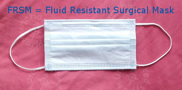 FRSM = Fluid Resistant Surgical Mask. Pic of a white rectangular mask, with folds along its middle and two ear loops.