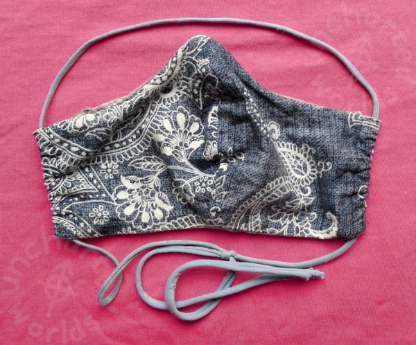 Fabric mask, quite floppy. The main fabric part has a printed pattern of line-drawn white flowers on a mid-blue background. Its headband and neck band is made of a thin curled-up strip of lighter blue stretch fabric, with a knot on the neck-band side to set its tightness.