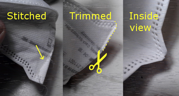 Three photos in a sequence. First photo shows the chin of an FFP mask, with a line of stitching to take a tuck in the edge. Second photo shows how the mask is trimmed back next to the line of stitching. Third photo shows the seam from the inside, as you'd see if it you were about to put on the mask.