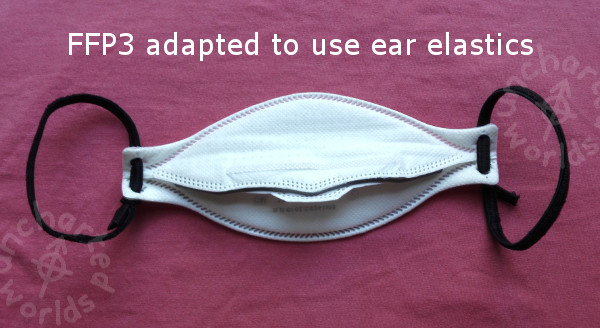 Not everyone likes the elastics which go behind your head. Here’s one of the FFP3s adapted to use ear elastics instead:FFP3 adapted to use ear elastics. A shaped white mask seen from the angle where you'd be about to put it on, with a narrow grey foam strip across the nose area. It has black elastic ear loops.Ear loops typically don’t hold on to your face quite as well as the behind-your-head style. So this adaptation potentially makes the mask slightly less effective, because the seal might not be as tight. But as one of the experts said, “the best mask is one you’ll actually wear”.